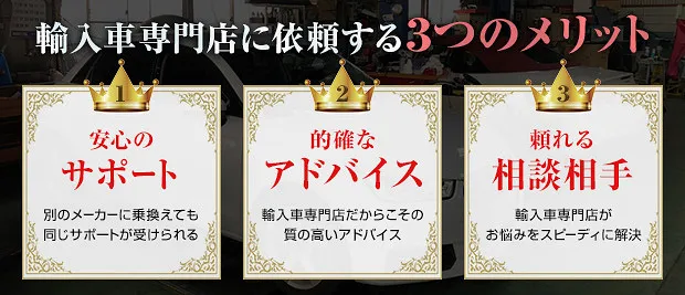 輸入車オーナーさまにご提案したいことは、ディーラーだけではなくいつでも相談できる整備工場とつながりをお持ちいただくこと。輸入車の場合はお車のメーカーによって、車のメンテナンスの注意点や起こりやすいトラブルも全然違います。整備工場とつながりを持っておくことで「BMWからアウディへ乗り換えよう。」なんてときでも同じサポートをずっと受けれるので安心のカーライフをお過ごしいただけます。